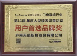 ???? 同期,由中國建筑金屬結(jié)構(gòu)協(xié)會(huì)主辦,中國幕墻網(wǎng)承辦的“第十一屆AL-Survey2015-2016中國幕墻網(wǎng)年度大型讀者調(diào)查評選活動(dòng)”頒獎(jiǎng)儀式在在廣州廣交會(huì)威斯汀酒店隆重舉行,天辰股份榮獲“用戶首選品牌獎(jiǎng)”。