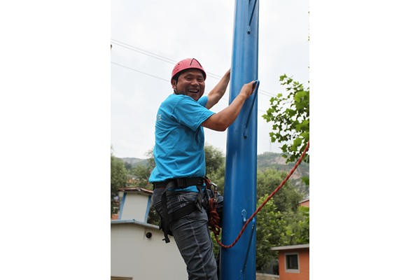 此次拓展訓(xùn)練加大了難度,增加了高空斷橋項目。挑戰(zhàn)人員需自行爬上八米的立柱,從很窄的木板上走過,然后跨越到一米半以外的另一塊木板上,然后從兩塊木板中間跳下。雖然有保險繩保護,但對于參與者的心理和體力還是一個很大的挑戰(zhàn)。